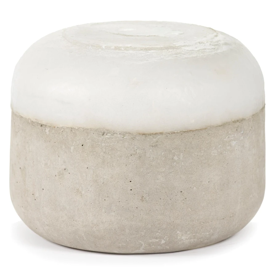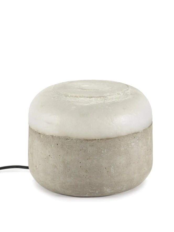 De Concrete by Renate Vos vloerlamp buiten medium van Serax is rond en heeft een cementkleurig uiterlijk. De lamp heeft een diameter van 33 centimeter, een hoogte van 28 centimeter en een gewicht van 9,5 kilogram. De vloerlamp heeft een metalen onderstel en een betonnen lampen kap met een bovenzijde van silicone. De lamp is voorzien van een 5 meter lang snoer. De buiten lamp heeft een ingebouwde LED lichtbron met een maximale voltage van 240.