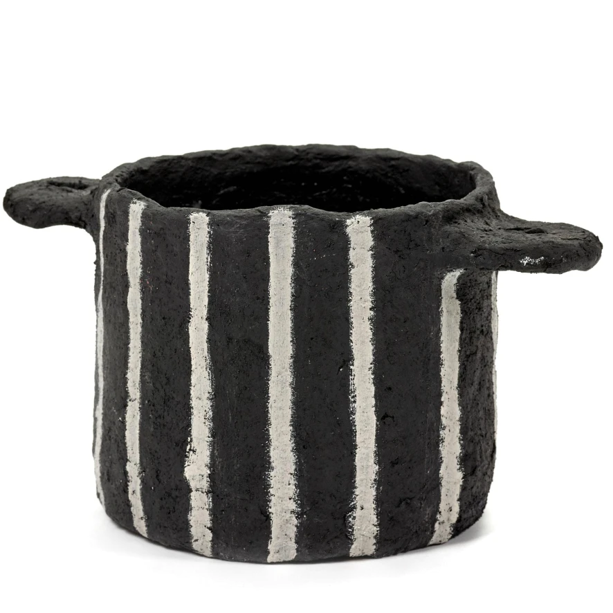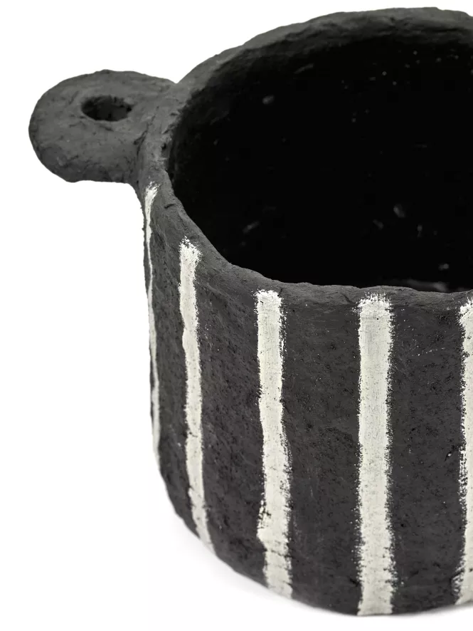 De Earth stripes pot, ontworpen door Marie Michielssen, van Serax heeft een lengte van 24 centimeter, een breedte van 16,5 centimeter en een hoogte van 13,5 centimeter. De pot is gemaakt van papier-maché. De binnenzijde is bekleed met een glasvezelafwerking.