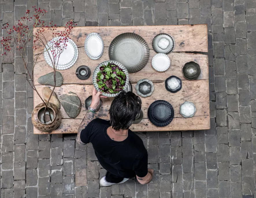 Het Inku dienblad op voet M, ontworpen door Sergio Herman, voor Serax heeft een diameter van 21 centimeter en een hoogte van 8 centimeter. Het dienblad, gemaakt van keramiek, weegt 1,625 kilogram en kan in de vaatwasser. Het dienblad is ook verkrijgbaar in een andere maten en in verschillende kleuren.