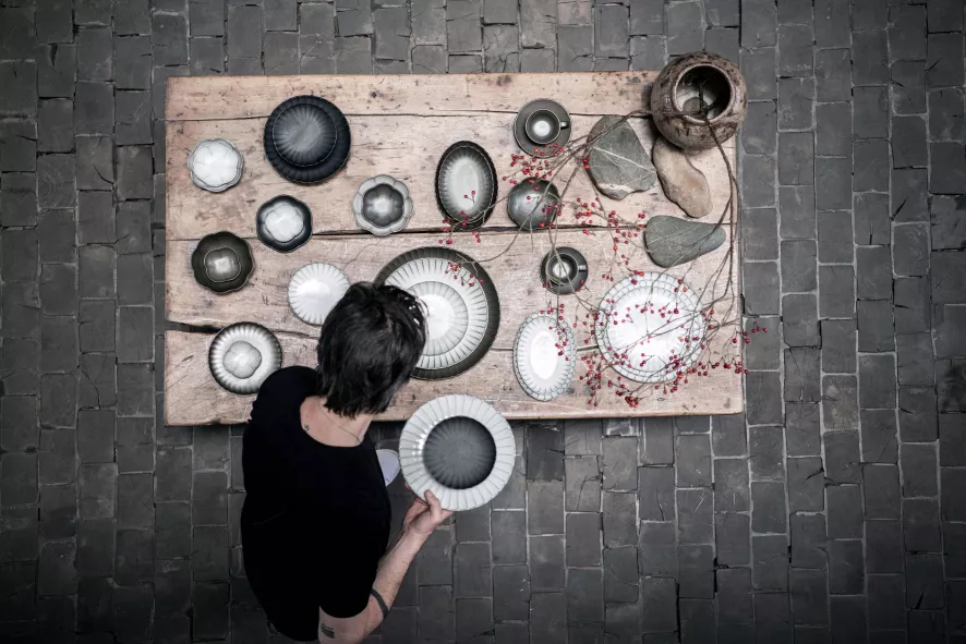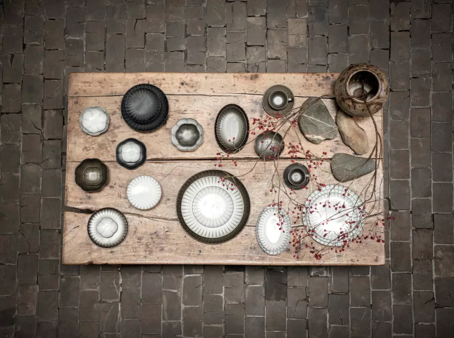 Het Inku dienblad op voet L, ontworpen door Sergio Herman, voor Serax heeft een diameter van 24 centimeter en een hoogte van 6,5 centimeter. Het dienblad, gemaakt van keramiek, weegt 1,2 kilogram en kan in de vaatwasser. Het dienblad is ook verkrijgbaar in een kleinere maten en in verschillende kleuren.