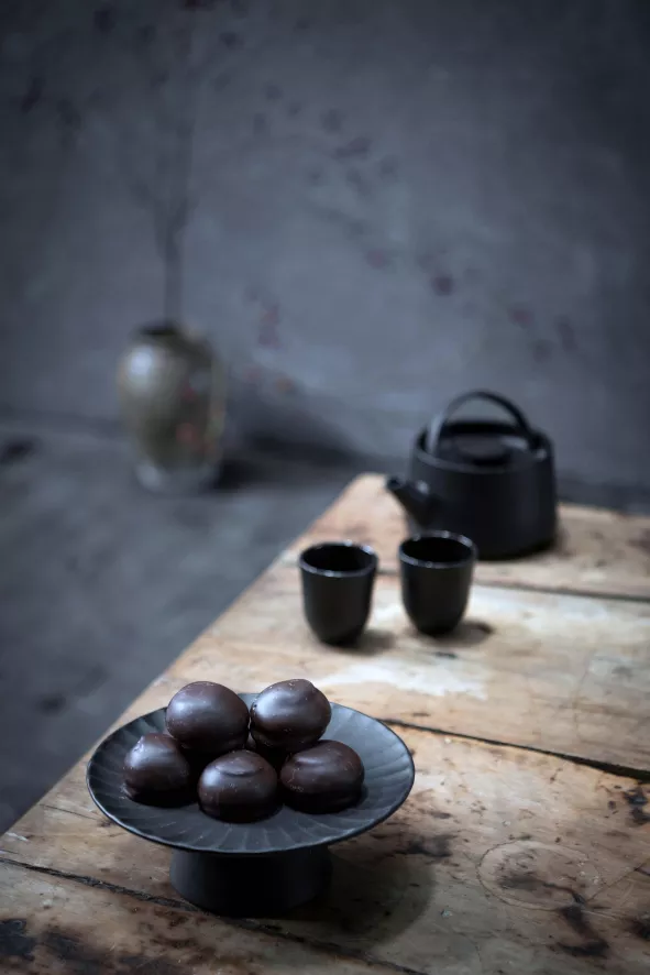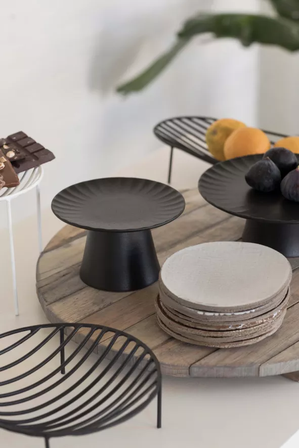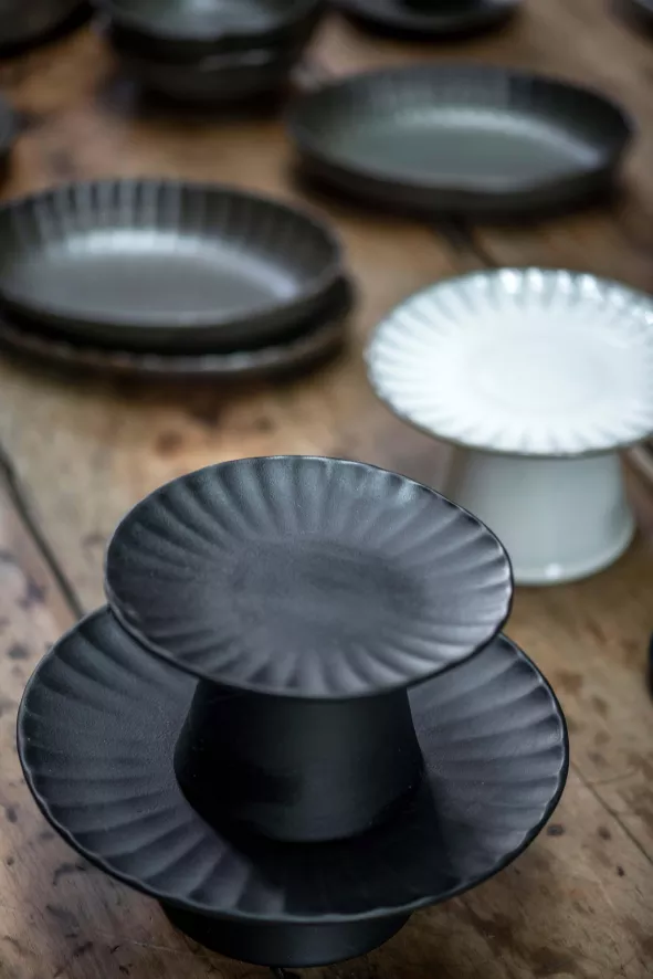 Het Inku dienblad op voet S, ontworpen door Sergio Herman, voor Serax heeft een diameter van 15 centimeter en een hoogte van 9 centimeter. Het dienblad, gemaakt van keramiek, weegt 0,575 kilogram en kan in de vaatwasser. Het dienblad is ook verkrijgbaar in een grotere variant en in verschillende kleuren.