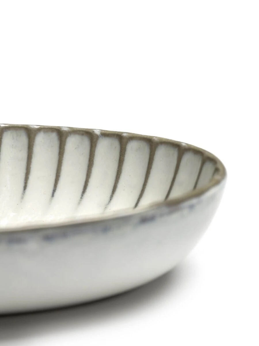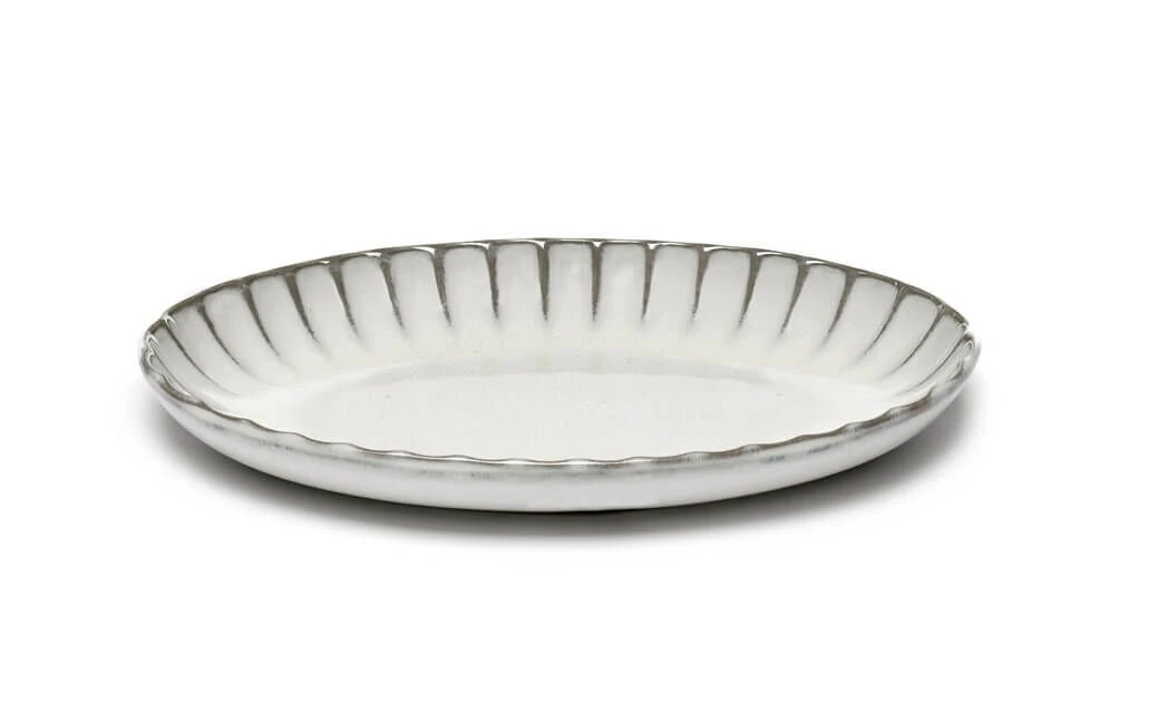 De ovale serveerschaal van Serax INKU heeft een diameter van 22 x 15,4 cm en is 2,7 cm hoog, en is aan de rand voorzien van een decoratief ribbelpatroon. De kom is gemaakt van steengoed (aardewerk) en is wit geglazuurd. Gebruik voor het serveren van gerechten.