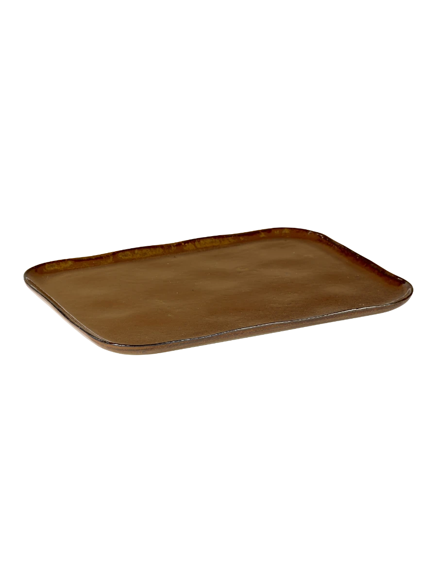 Het rechthoekige Merci bord van Serax is gemaakt van okerbruin geglazuurd zandsteen. Het bord is 32 cm lang, 23 cm breed en 1,4 cm hoog.