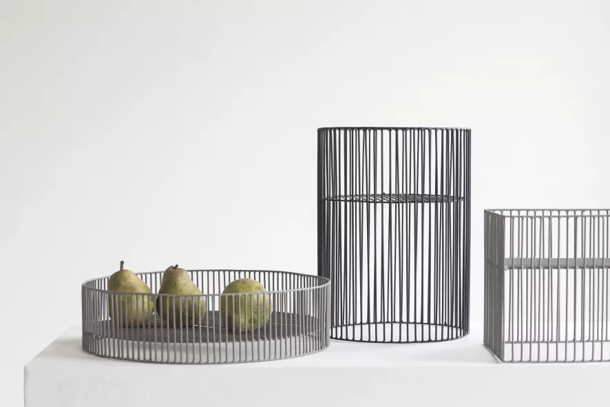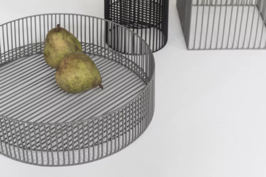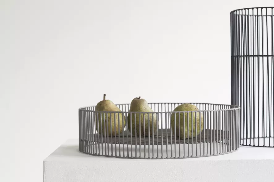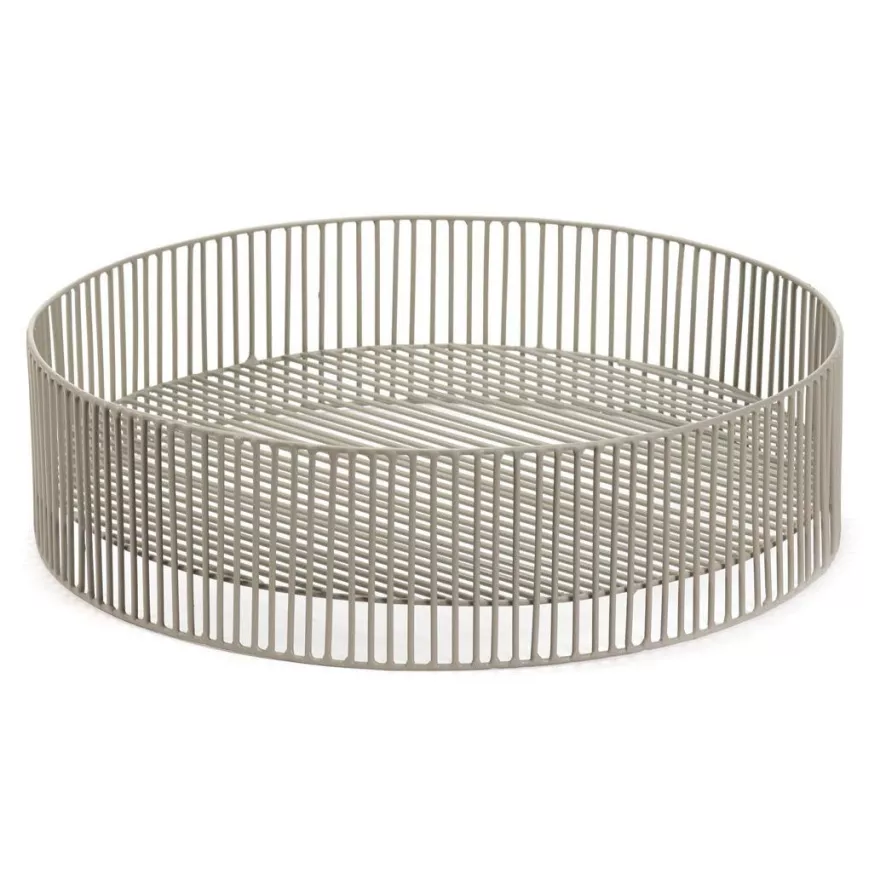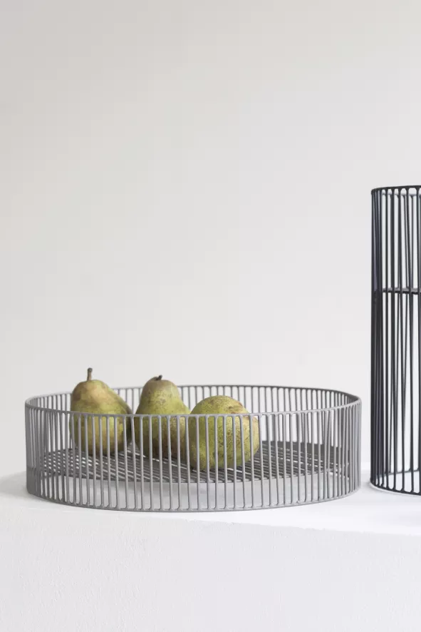 De Basket turn schaal 40 rond, ontworpen door Antonino Sciortino, van Serax heeft een diameter van 40 centimeter en een hoogte van 10 centimeter. De schaal is gemaakt van metaaldraden, afgewerkt met een grijze coating. De schaal weegt 1,6 kilogram.