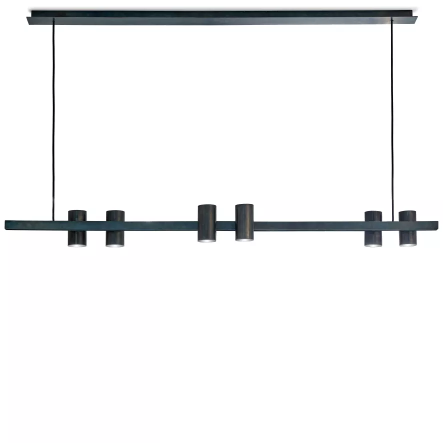 De Sofisticato Nr 27 hanglamp van Serax is 140 centimeter lang, 17,6 centimeter breed en 12 centimeter hoog. De plafondkap is 124 centimeter lang, 7 centimeter breed en 3,5 centimeter hoog. De kroonluchter is gemaakt van blauwstaal en met de hand gefreesd, gedraaid, gezaagd, geboord en gelast door vakmensen. Daarna wordt het staal handmatig verhit en zorgvuldig geboend. Door deze procedure wordt het staal roestvrij, en geeft het ook zijn kenmerkende blauwe gloed. Alle armaturen kunnen onderling gecombineerd worden. De lamp is ontworpen door designer Koen van Guijze.