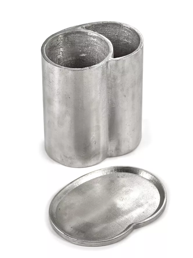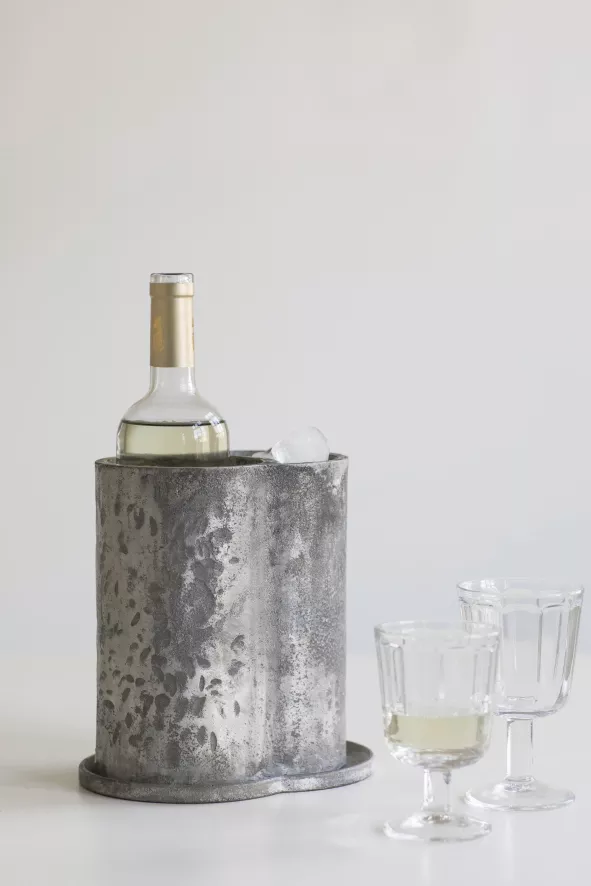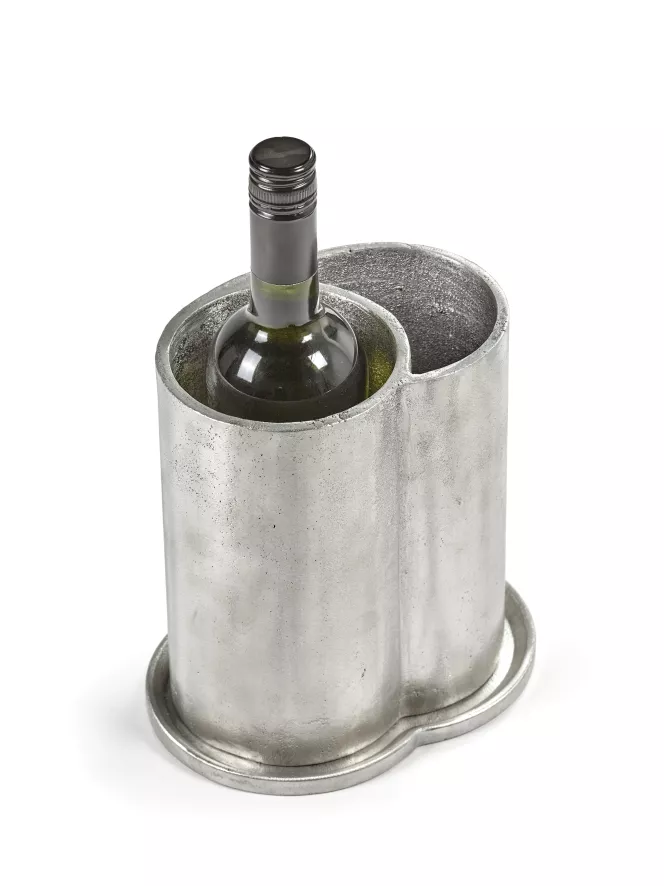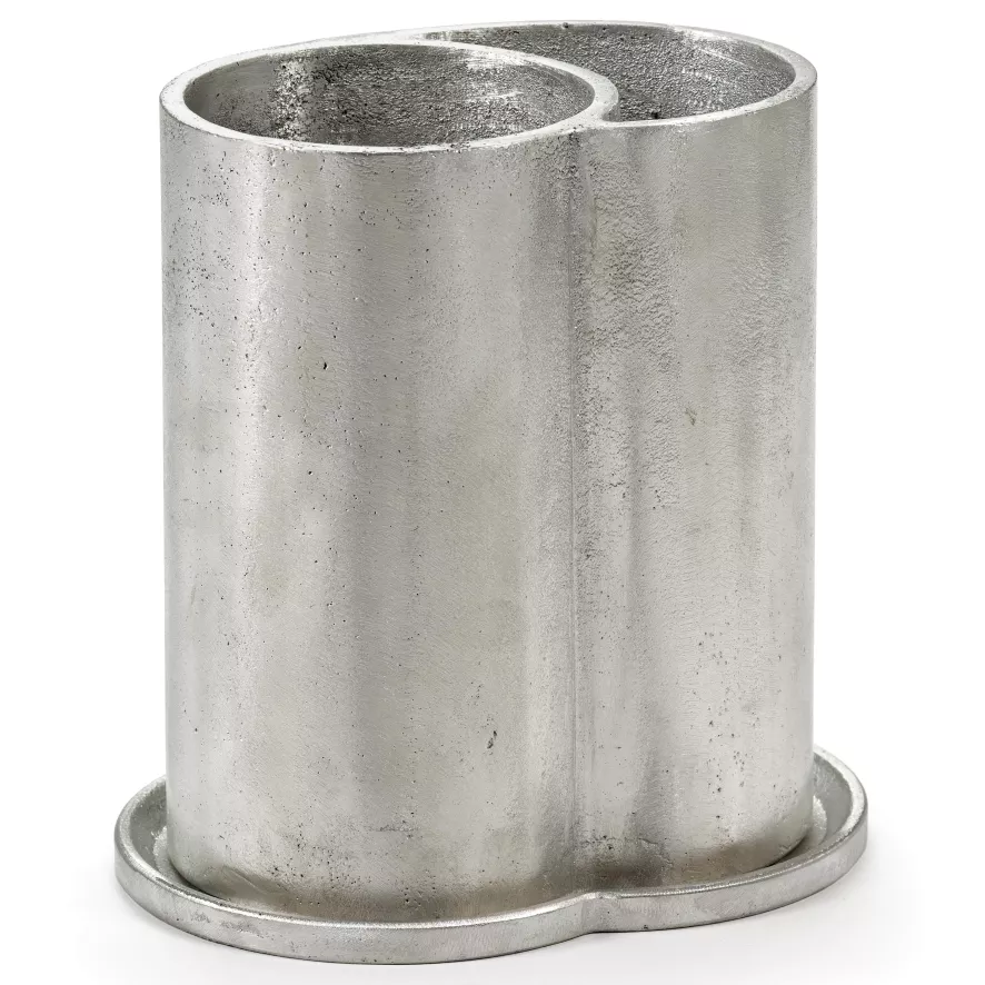 De Surface by Sergio Herman wijnkoeler van Serax is grijs en heeft twee compartimenten: één voor de fles en één voor extra ijs. De fleskoeler heeft een lengte van 20 centimeter, een breedte van 15 centimeter, een hoogte van 21 centimeter en een inhoud van 40 kilogram. De wijnkoeler is gemaakt van aluminium.