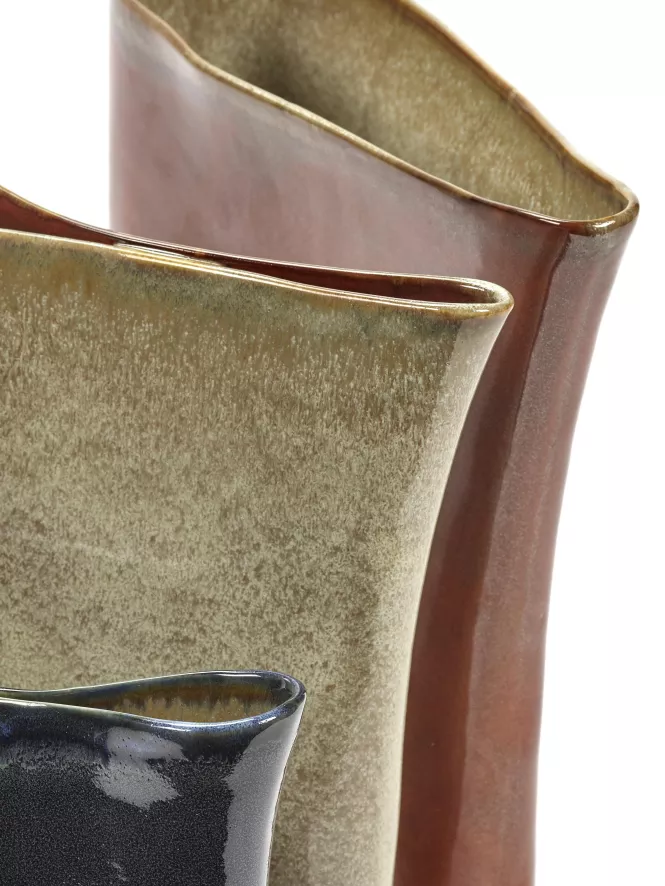 De Terres de Rêves vaas 25, ontworpen door Anita Le Grelle, van Serax heeft een lengte van 31,5 centimeter, een breedte van 11,2 centimeter en een hoogte van 25 centimeter. De vaas is gemaakt van aardewerk en is afgewerkt met een glanzend glazuur. De vaas weegt 1,8 kilogram.