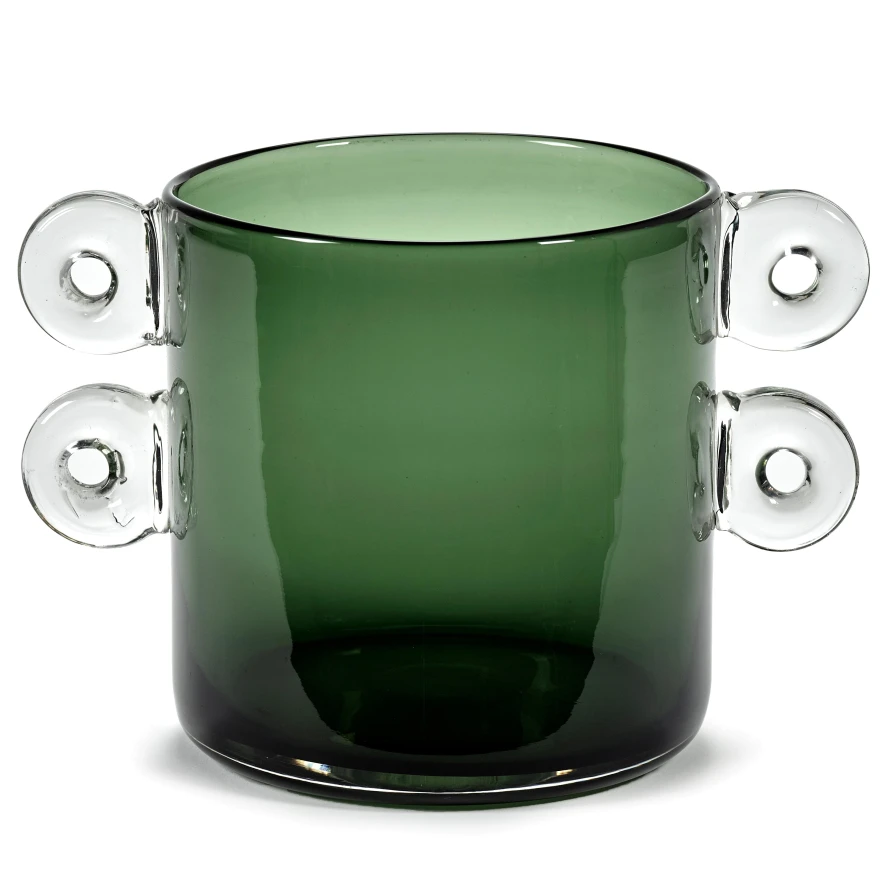 De Wind & Fire by Marie Michielssen vaas Ø27 groen van Serax heeft een diameter van 27 centimeter en een hoogte van 18 centimeter. De vaas is gemaakt van donkergroen gekleurd glas en is voorzien van transparante oortjes.