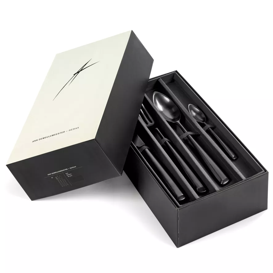De Zoe bestekset, ontworpen door Ann Meulemeester, van Serax is van mat zwart roestvrij staal. De set bestaat uit zes dinervorken, zes dinermessen, zes dinerlepels en zes theelepels.